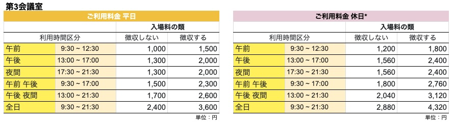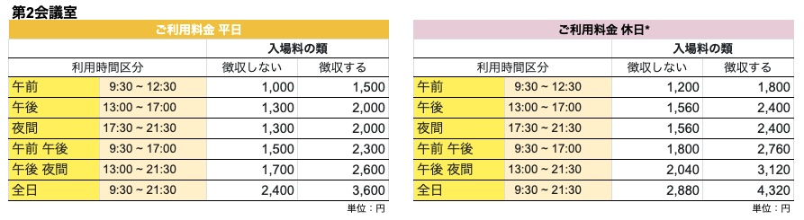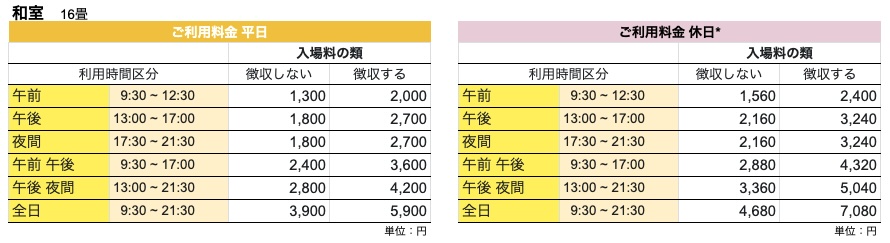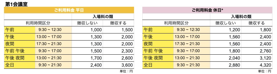 | 利用時間 | 利用時間には、準備、後片付け、清掃の時間を含みます。 |
