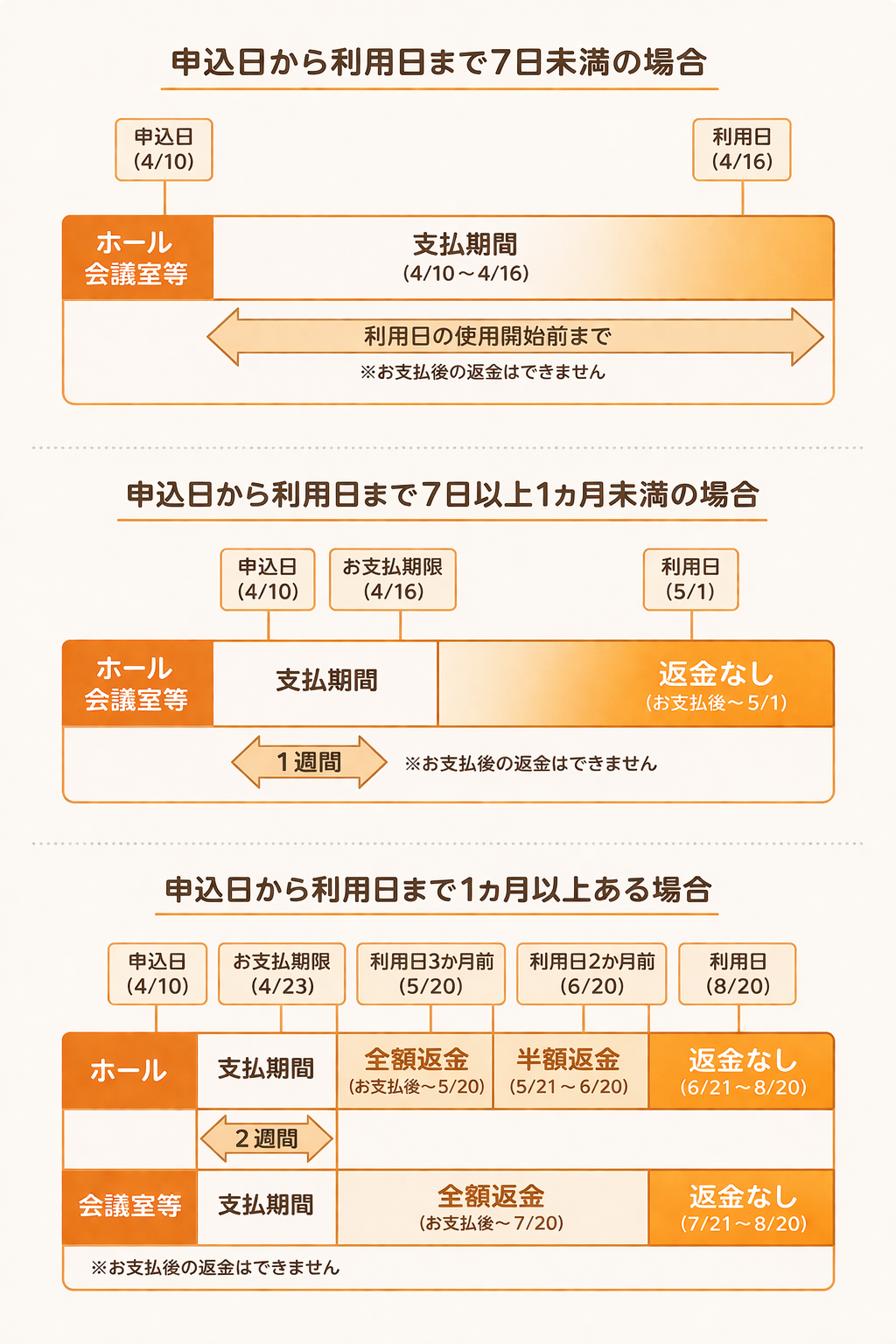 なお貸室のお申込は、ご利用日の6カ月前から受付します。施設利用料のお支払後、ご予約完了となります。